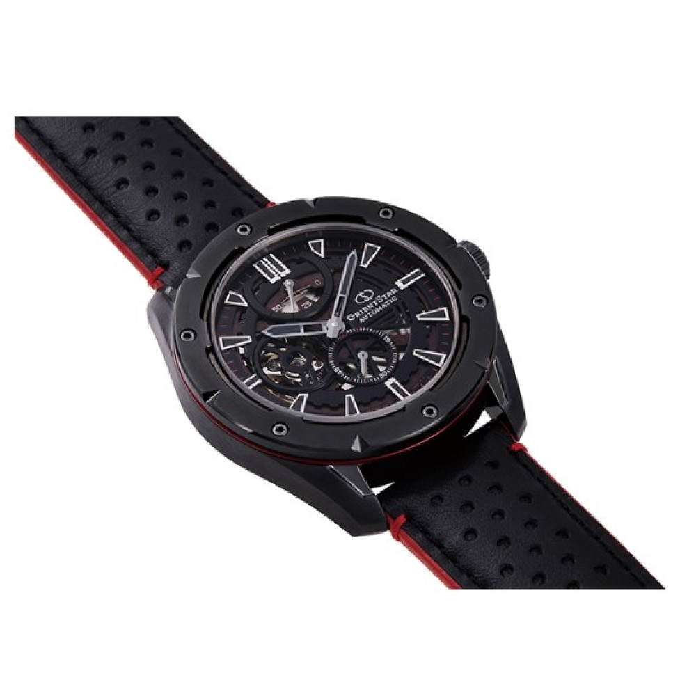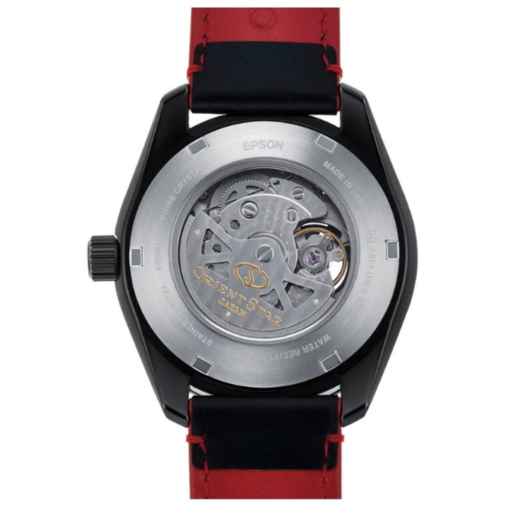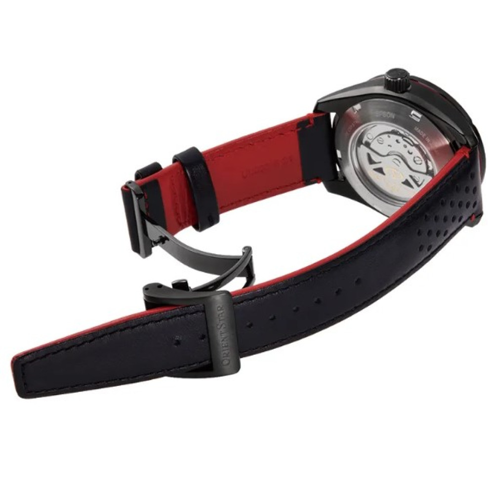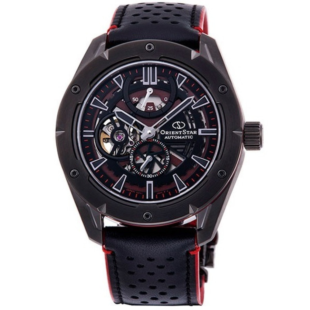 Оформить заказМужские японские наручные часы Orient Star AV0A03B [RE-AV0A03B] скелетоным видом циферблата. Циферблат состоит из двух ажурных пластин, наложенных друг на друга для создания эффекта глубины и трехмерного изображения. Сотовый узор снизу и зубчатый мотив сверху подчеркивают механические особенности часов. Безель серого цвета с покрытием. Калибр механизма F6F44 с 24 камнями и 21600 колебаний в час. Ретроградный указатель запаса хода 50 часов с возможностью ручного завода и точностью +25 сек. -15 сек.. Смещенная секундная стрелка в отдельном циферблате в позиции 6 часов. Механизм остановки времени для настройки точности секундной стрелки. Прочное, устойчивое к царапинам, сапфировое стекло с антибликовым покрытием обеспечит защиту часов от повреждений. Прозрачная и завинчивающая задняя крышка. Завинчивающая заводная головка. Высокая водонепроницаемость 100WR (10 Бар) идеально подходит для плавания с маской и трубкой. Корпус часов выполнен из нержавеющей стали (SUS316L). Ремешок из натуральной кожи с раскладывающийся пряжкой с кнопкой. Магнитное сопротивление 4800 А/м. Вес 109 г.