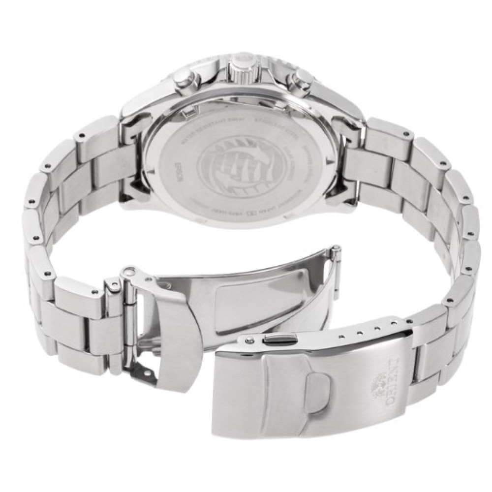 Оформить заказМужские японские наручные часы Orient TX0204E [RN-TX0204E] часы-хронограф на солнечной энергии. Калибр механизма VS752. Часы оснащены вращающимся в одном направлении безелем и металлическим циферблатом с изысканной полированной отделкой. Зарядка солнечной батареи осуществляется через три дополнительных циферблата: 24-часовой индикатор в положении 3 часов, 60-минутный счётчик в положении 6 часов и малый секундный циферблат в положении 9 часов. Арабская цифра украшает положение 12 часов, а люминесцентная подсветка используется для обозначения цифр, индексов и стрелок, позволяя считывать время даже в темноте. Прочное, устойчивое к царапинам, сапфировое стекло обеспечит защиту часов от повреждений. Высокая водонепроницаемость 200 WR (20 Бар) идеально подходит для ныряния с аквалангом. Винтовая задняя крышка. Завинчивающаяся заводная головка с защитой. Корпус и браслет часов выполнен из нержавеющей стали. Раскладывающейся застежка с системой блокировки.